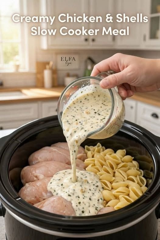 Here’s a comforting Creamy Chicken & Shells Slow Cooker Meal—all in one pot, creamy, cheesy, and perfect for a weeknight dinner: