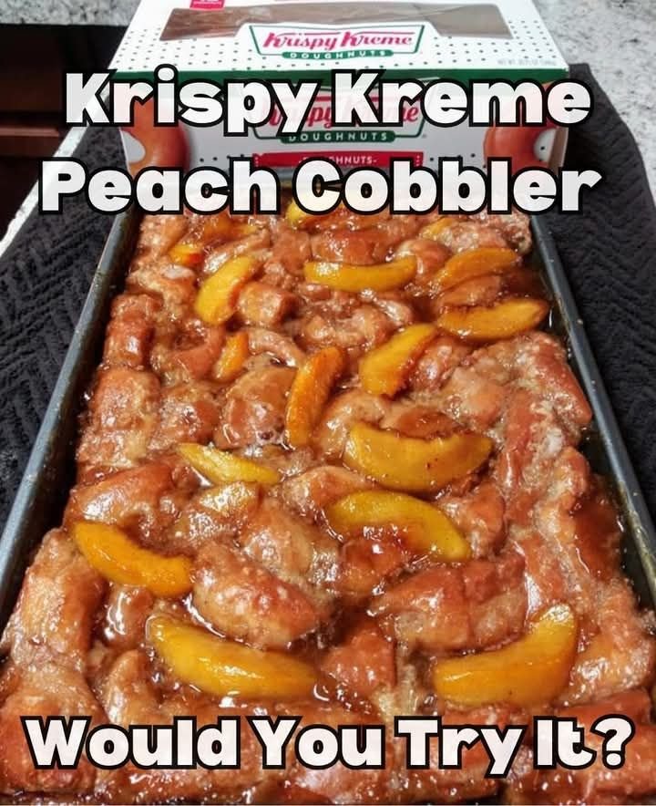 Here’s a Krispy Kreme–inspired Peach Cobbler — sweet, buttery, with a light doughy topping reminiscent of their doughnuts 🍑✨
