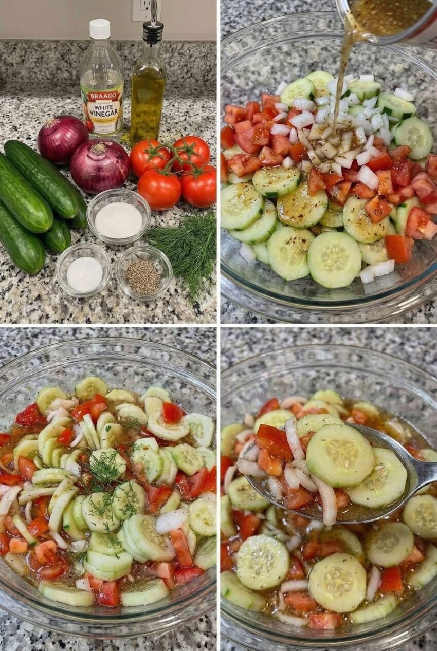 Here’s a quick and refreshing recipe for Marinated Cucumber, Onion, and Tomato Salad: