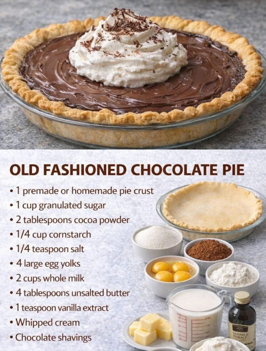 Here’s a classic Old-Fashioned Chocolate Pie—rich, creamy, and set in a flaky pie crust. 🍫🥧