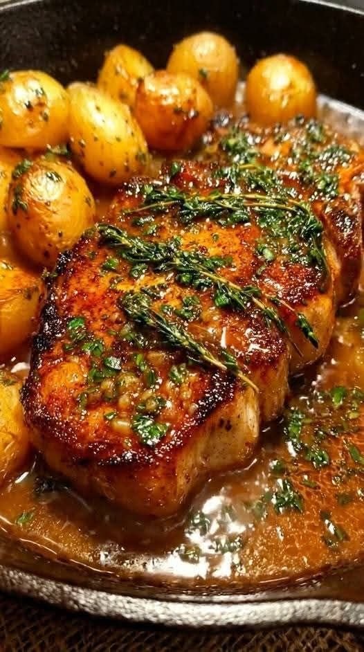Add butter + herbs + garlic. Spoon it over the chops like you mean it.